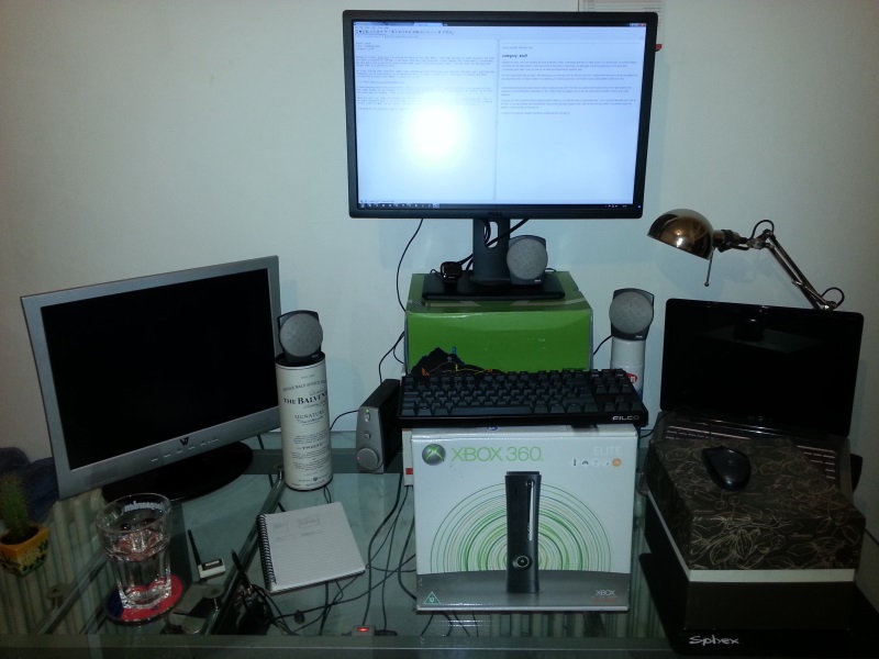 I knew keeping these boxes around would come in handy at some point. The Xbox box positions the keyboard at just the right height for my forearms to be horizontal and comfortable (so far). I had to raise my speakers up too else the sound was too distant - they're only cheap speakers.