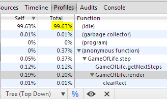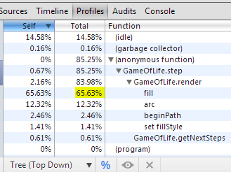 We can clearly see that the majority of time is spent in the fill method of the canvas context, so our first goal will be to reduce the number of calls to this method. Without calculating any statistics, observations of the visualisation indicate that relatively few cells actually change state in each step. With this in mind the code can be changed to not redraw every cell, but only those that need redrawing.